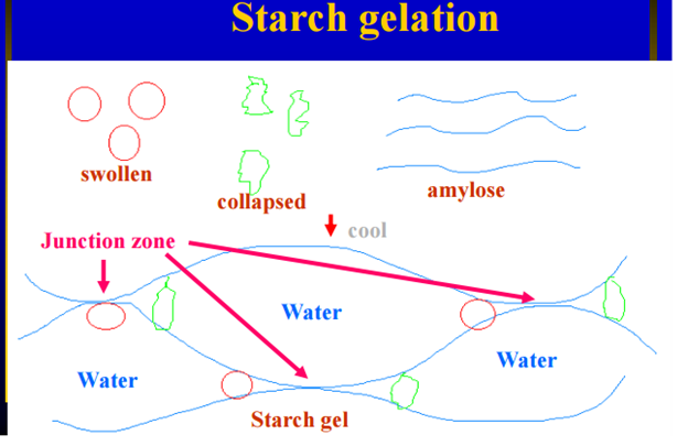 Cooked, unmodified starch, when cooled for a long enough period, will thicken (or gel) and rearrange itself again to a more crystalline structure.This process is called retrogradation. During the cooling process, starch molecules gradually aggregate to form a gel and molecular associations occur: Amylose-Amylose; Amylose-Amylopectin; Amylopectin-Amylopectin.