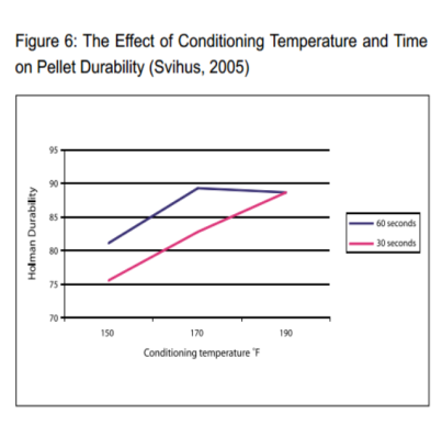 In the adjacent chart you can see the effect of conditioning temperature and time on pellet durability (Svihus 2005).